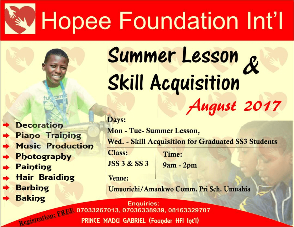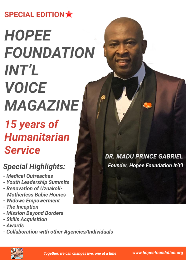 The vision of HOPEE FOUNDATION INTERNATIONAL is to be an anchor organizations that will focus on changing lives and making a difference in our community and be an extended arms and voice for the less privilege. HOPEE FOUNDATION INTERNATIONAL through its founders and partners will bring hope to the hopeless and empowerment to the orphans, youth and women in our generation and generations to come through skill acquisitions, scholarship and role modeling.